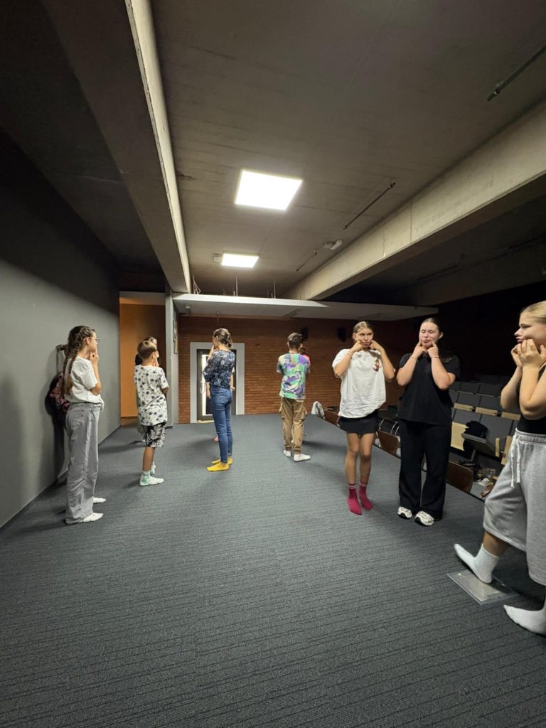 W czasie zajęć uczymy się występować w rzeczywistej przestrzeni teatralnej, z mikrofonami i z oświetleniem scenicznym na scenie Teatru Dobrego Słowa.